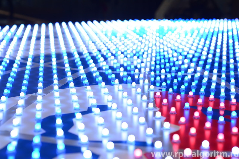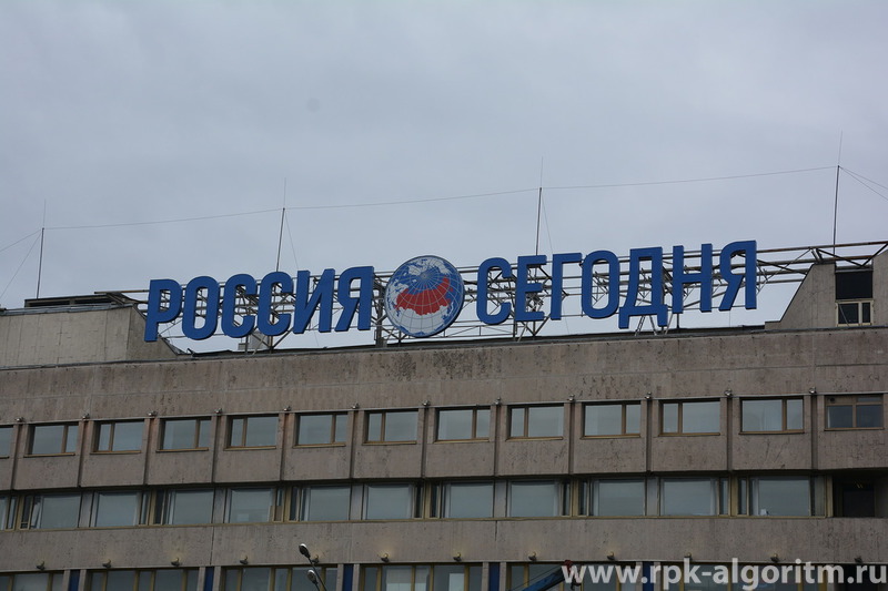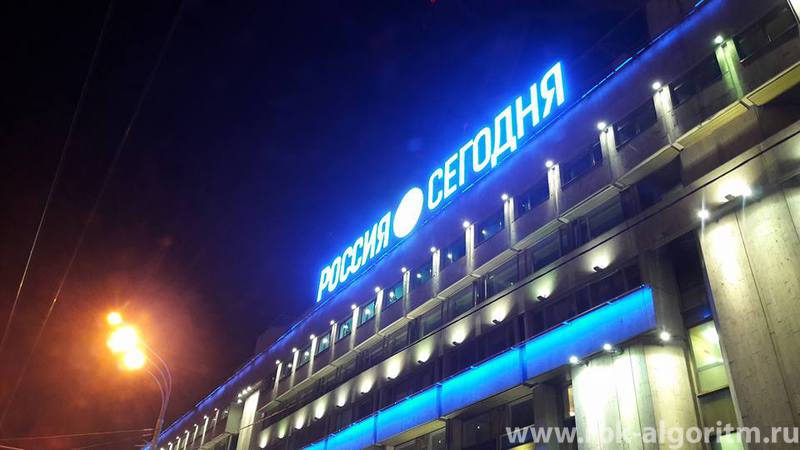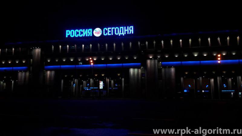 Крышная установка МИА "Россия Сегодня" с открытой светодиодной подсветкой на Зубовском бульваре. При производстве конструкции использовались два вида светодиодов - управляемые видеосветодиоды, установленные на "глобусе", и статичные светодиоды синего цвета. Видеосветодиоды позволяют задавать светодинамику логотипа - например, "заставлять" меридианы крутиться.