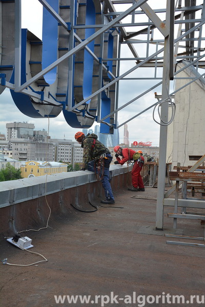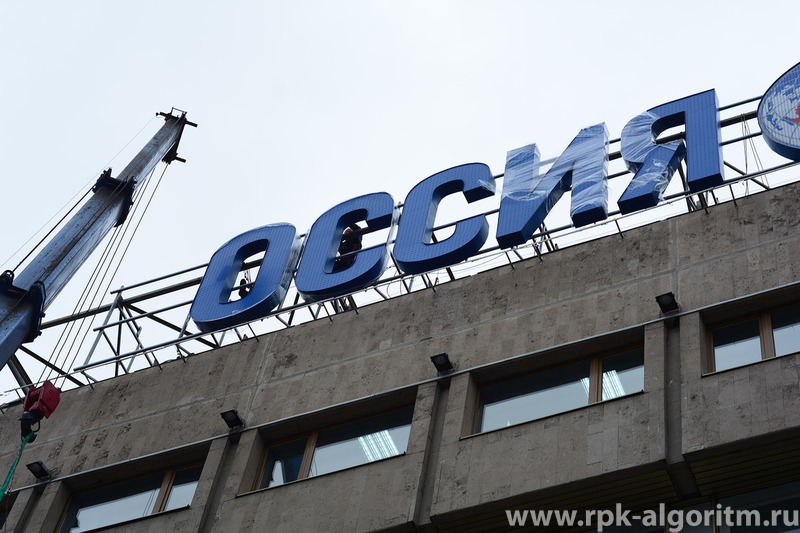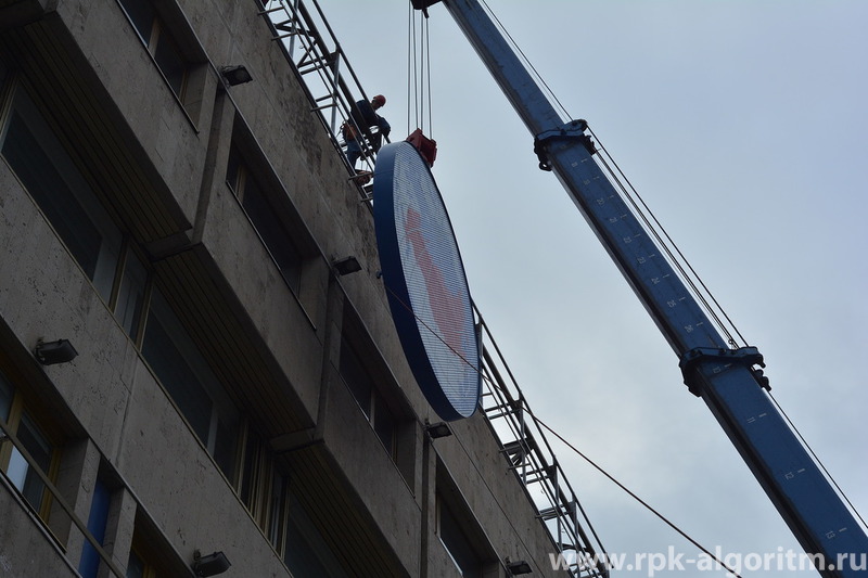 Монтаж рекламной конструкции осуществлялся при помощи спецтехники. Первым смонтированным элементом стал "глобус", относительно которого далее "выстраивались" остальные буквы.