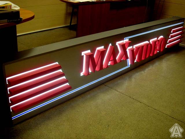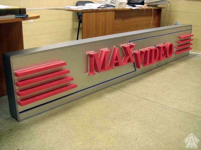 Внутренняя подсветка короба осуществляется люминесцентными лампами. Вокруг букв вырезан «кант», с помощью которого достигается световой эффект, похожий на контражур.