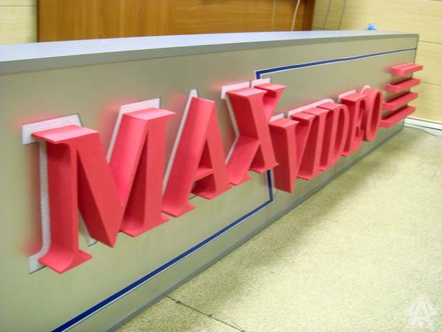 Интерьерная вывеска МАКСВИДЕО, состоящая из несветовых объемных букв из пенопласта, окрашенных в требуемый цвет.